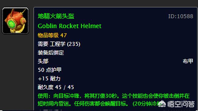 地精火箭头盔效果非常好,可以“打傻”目标30秒,相当于给任何职业都增加了一个闷棍效果,没记错的话当年“V大”就使用地精火箭头盔像玩家们展现了很多经典的野外PVP战斗。