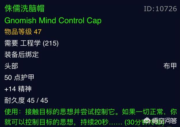 侏儒洗脑帽,相当于牧师的精神控制,如果使用得当的话,可以达到令人意想不到的想过,记得某个知名远古大神的视频中,就有使用侏儒洗脑帽控制对方阵营战士打人的情况。不过30分钟的冷却时间同样太长。