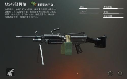 M249,机枪,子弹上限100发,最高伤害90,换弹时间8秒,如果提前换弹,节省时间,那可以说是枪中的霸王。