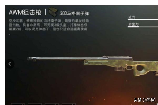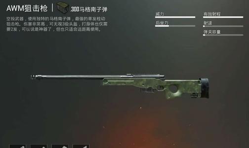 AWM狙击枪,使用.300马格南子弹,最强的单发栓动狙击枪,在空投里比较常见,基本每场游戏都会出;