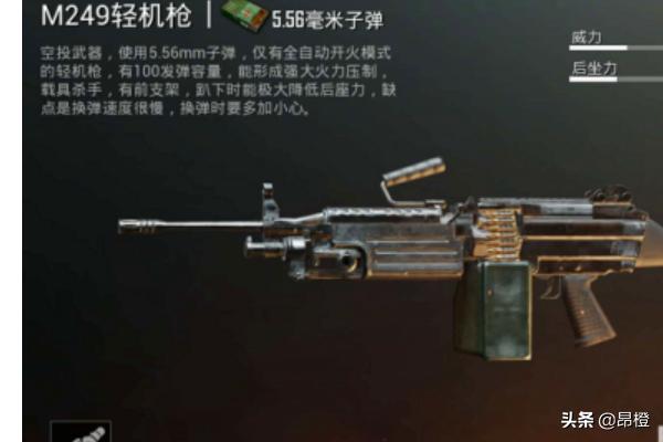 5.大菠萝M249轻机枪,空投里的稀有武器,缺点就是只能安装倍镜,其他配件都不能使用;