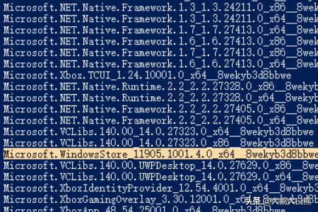 5、在列表中我们找到“Microsoft.WindowsStore”微软应用商店,复制后面的安装包位置进剪切板“Microsoft.WindowsStore_11905.1001.4.0_x64__8wekyb3d8bbwe”。