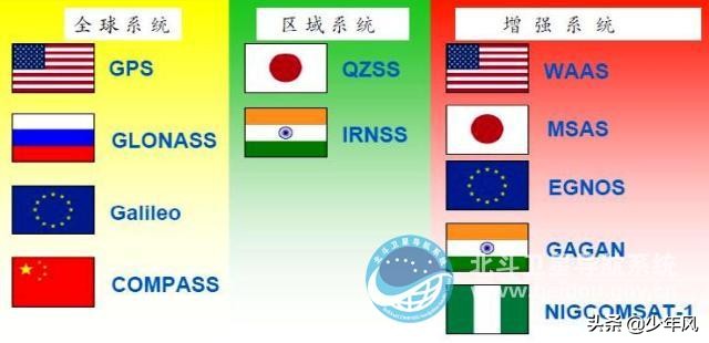 全球定位系统:美国的GPS、俄罗斯的Glonass、欧洲的Galileo、中国的北斗卫星导航系统。增强系统:美国的WAAS、欧洲的EGNOS和日本的MSAS等。局域定位系统:印度的IRNSS、日本的QZSS。