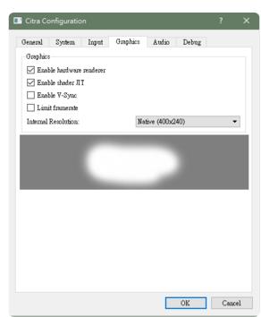 4. 如果是nightly系列版本,如下图所示,在【 Enable hardware renderer】和【Enable shader JIT】前的方框内打钩,下面的Internal Resolution 选择【 Native (400x240)】;容