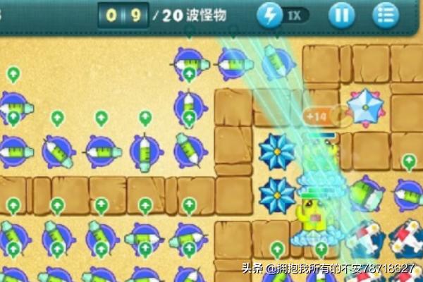 6、第9波怪物时,所有道具都清理完毕。由于前几波怪物都不是很厉害,所以期间只在图中建立了两个雪花炮塔用来晕住怪物
