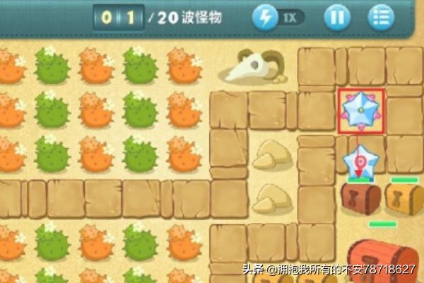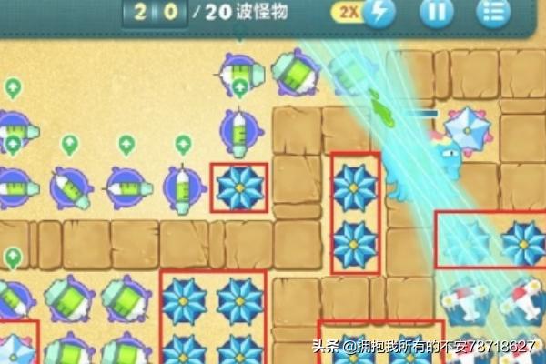 7、消灭最后一波怪物,期间可以卖掉不少毒针炮塔,重新建造雪花炮塔和冰冻星星炮塔(红框的就是建造的炮塔)