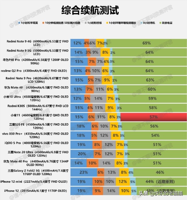 虽然小米用了比较大的4600毫安时单电芯电池,另外针对不同场景做了刷新率的适配,但是由于2K 120Hz的屏幕外加骁龙888这个耗电大户。因此小米11的续航总体不算好,只能算一般。下面这张图就是网友关于续航的评测结果。
