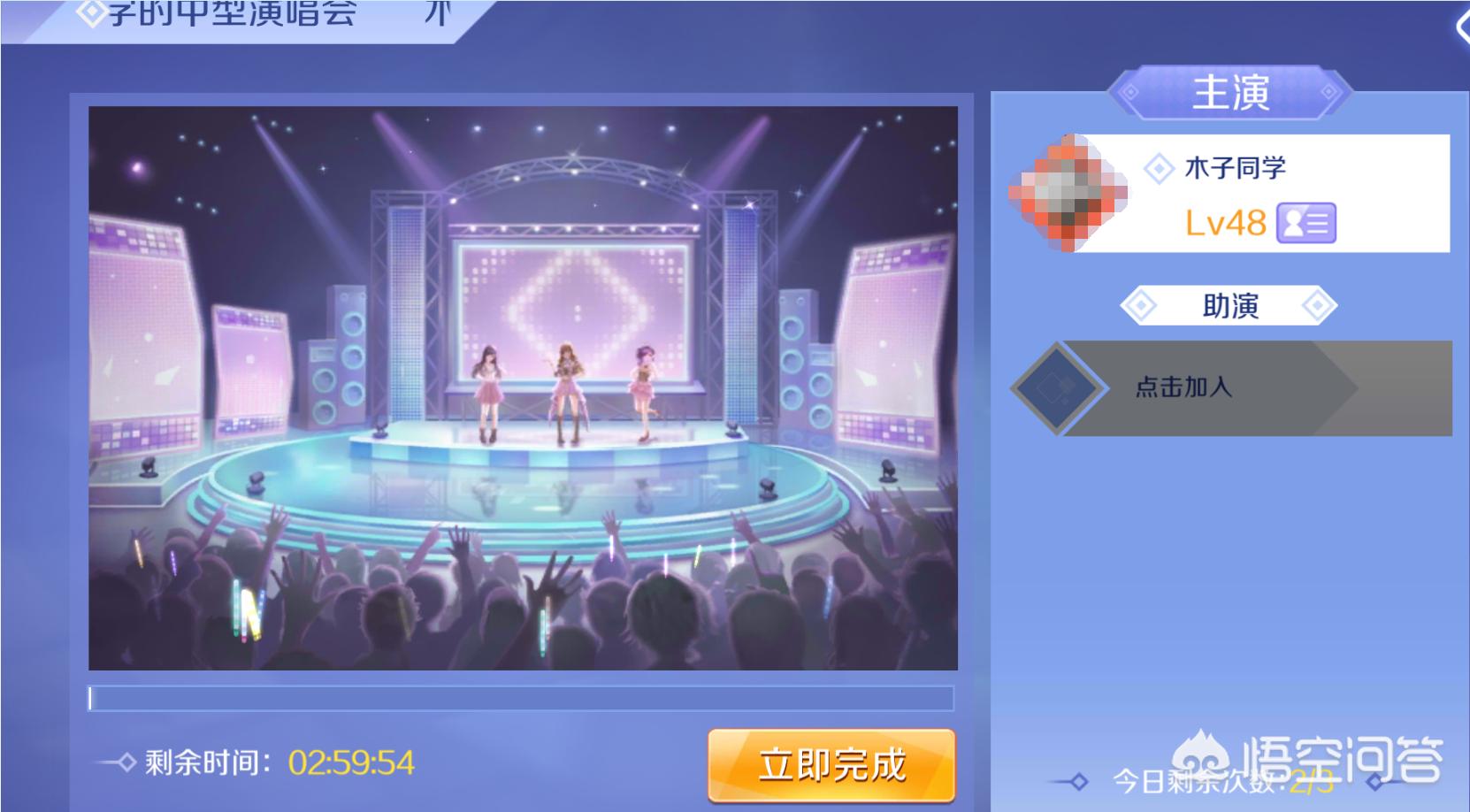二、大型演唱会:需要6个小时,4个助演位,需要花费20钻石,可以获得更多的舞团币、经验、知名度贡献。