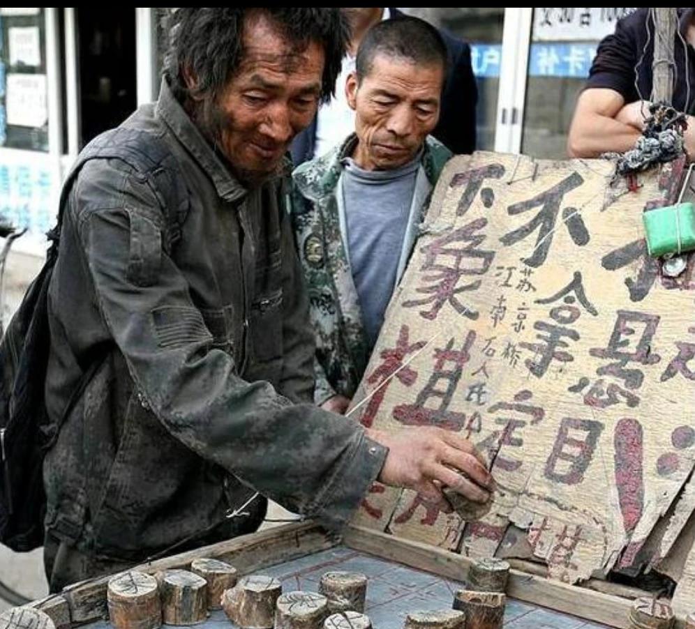 他四海为家,独自闯荡江湖,没钱买象棋,就自己做一副。走遍大街小巷,到处摆摊与人对弈数十年来未曾一败。