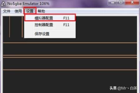 4、No$GBA的相关设置:如果不习惯英文界面,可以网上搜索下载No$GBA的汉化版程序其运行游戏后的界面如下。单击“设置”后,选择“模拟器配置”或者“控制器配置”。