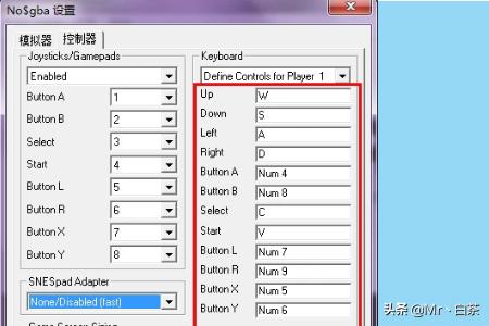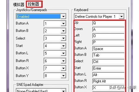 5、选择“控制器”选项卡,在右侧的“Keyboard”位置可设置键盘操作的按键。如下图所示,NDS上的上,就是电脑上键盘Q,以此类推。