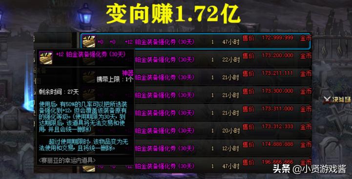 还真别说,这个小奖在拍卖行还挺贵的,在同等50%几率的+12铂金强化卷高达1.72亿,玩家相当于变相了赚了1.72亿,赚简直血赚,不过很可惜的黑钻售货机抽到的卷子只能自己使用,对此这位玩家开启了直播模式,同时也引起了很多观众的围观,但其实大部分玩家都是来看他笑话的,毕竟只有50%的成功几率,在加上TX特有的虚高几率,失败的几率简直不要太高。