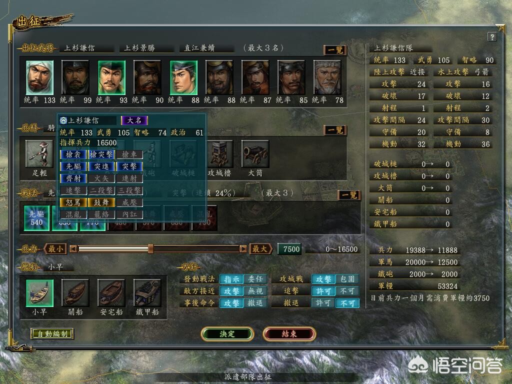 1558年5月左右,研发出蹄铁科技,有南蛮科技携带食更好,组织两队骑兵出征,拥有隐藏战法“车轮”的三人上杉谦信、上杉景胜、直江兼续一队,上杉老爹、堂兄、军师宇佐美定满一队,所配战法如图。