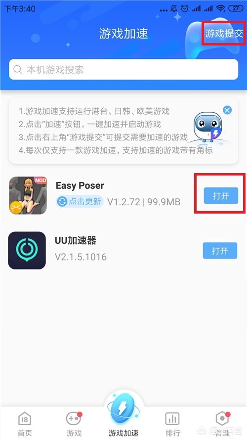 3、不要脸强推一波18游戏盒,优点嘛还是免费,游戏覆盖全(游戏覆盖18>biubiu>UU),如果你需要加速的游戏在前面提到的两款里面找不到的话,试试从18游戏盒里面找找看,点底部菜单栏里的【游戏加速】,找到你要玩的游戏,点加速即可,如果这里也没有覆盖到游戏,那么还可以点击页面右上角的【游戏提交】,找到你需要加速的游戏点击【选择】即可。