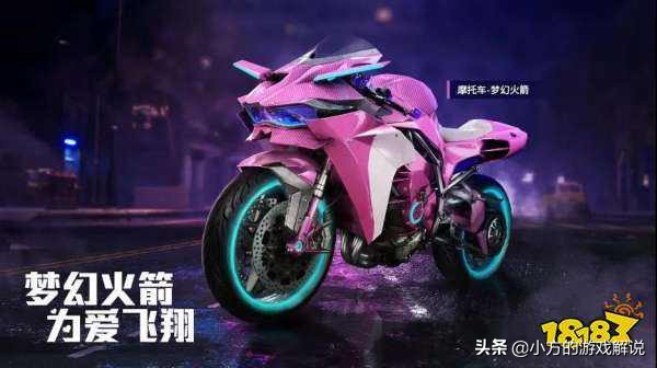 二、第二次载具皮肤。第二次载具皮肤出现是一辆摩托车,光子称它为:梦幻火箭。这款皮肤出现之后,得到很多情侣的喜爱,特别是一些女玩家,几乎都要买上一辆,便于到和平大陆的各个地方去打卡。