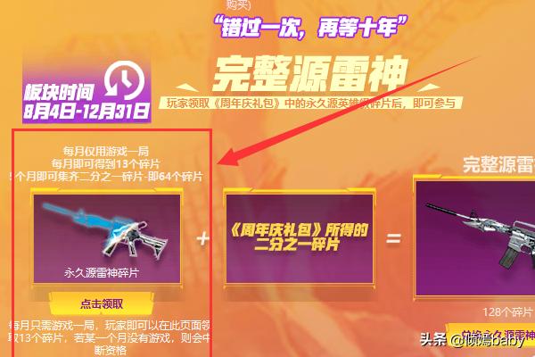 4、另一半的源雷神分为5个月领取,每个月可以领取13个碎片,领取地址如下图所示(也是在这个活动页面里),玩家只需每月进游戏玩一局就可以领,等到领完集齐另一半源雷神碎片后就可以兑换永久英雄级源雷神了。