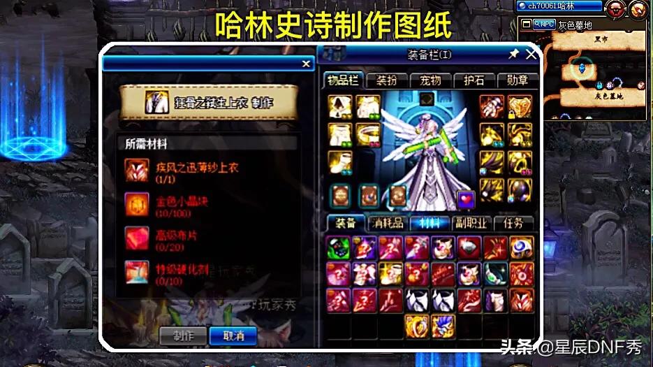 (3)接下来就是用图纸来制作哈林史诗,如图所示,制作哈林史诗,需要一件哈林传说装备,100个金色小晶体,20个高级布片,10个特级硬化剂。