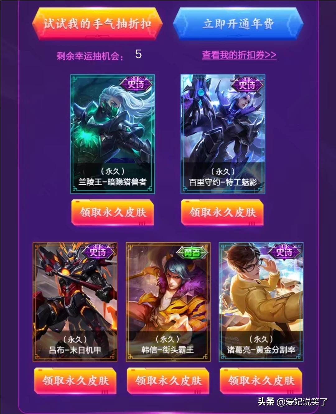 在这里再次强调一点,就是赵云皮肤和永久英雄开通免费,是不可以参与你抽取的折扣的,需要原价购买。你抽取折扣只能五个皮肤选一个的活动。