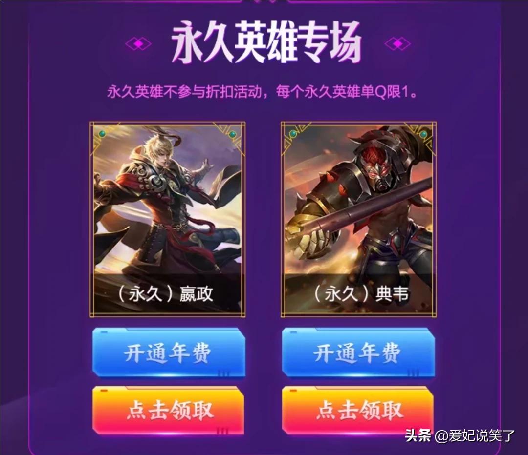 还有就是开通免费可以领取永久英雄,总共是两个英雄,一个人嬴政,一个是典韦。嬴政我还可以理解,但是典韦我就有点想不通了。可能是典韦这个英雄比较强吧这个赛季。