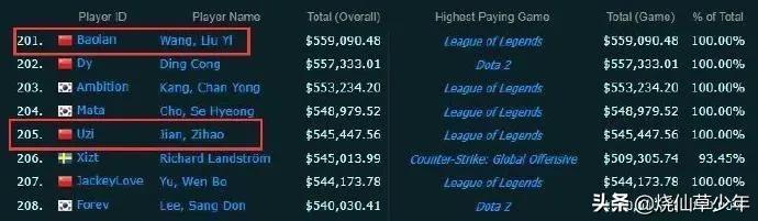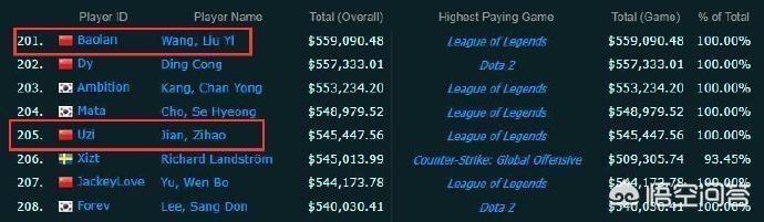 但是就是这样的一位选手,在电竞选手收入的排行榜上不要说前一百名,就连前二百名都没能进去,排名205,收入为五十四万美金。这些收入囊括了uzi选手在俱乐部内的薪水以及参加大大小小赛事的奖金,看上去不少,但是跟榜上其他人一比较,实在是不起眼。