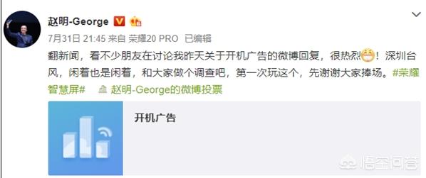 华为荣耀“智慧屏”在上市之前,荣耀的赵明就做过用户开机广告的调查问卷。当然,肯定是没有用户希望自己购买的产品内置广告,这里可以看作是赵明提前宣传荣耀“智慧屏”不会内置广告的一种方式!此举无疑会吊足用户兴趣,给此款产品带来较大的关注度。