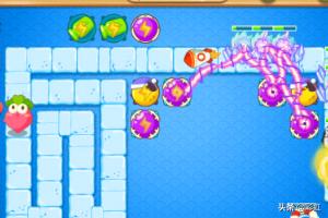 然后左边的魔法球迅速把上方的冰块打掉,然后把顶部靠左的瓶子打掉,然后把靠左边下方的绿色雪糕打掉。 首先要把这个任务做了。