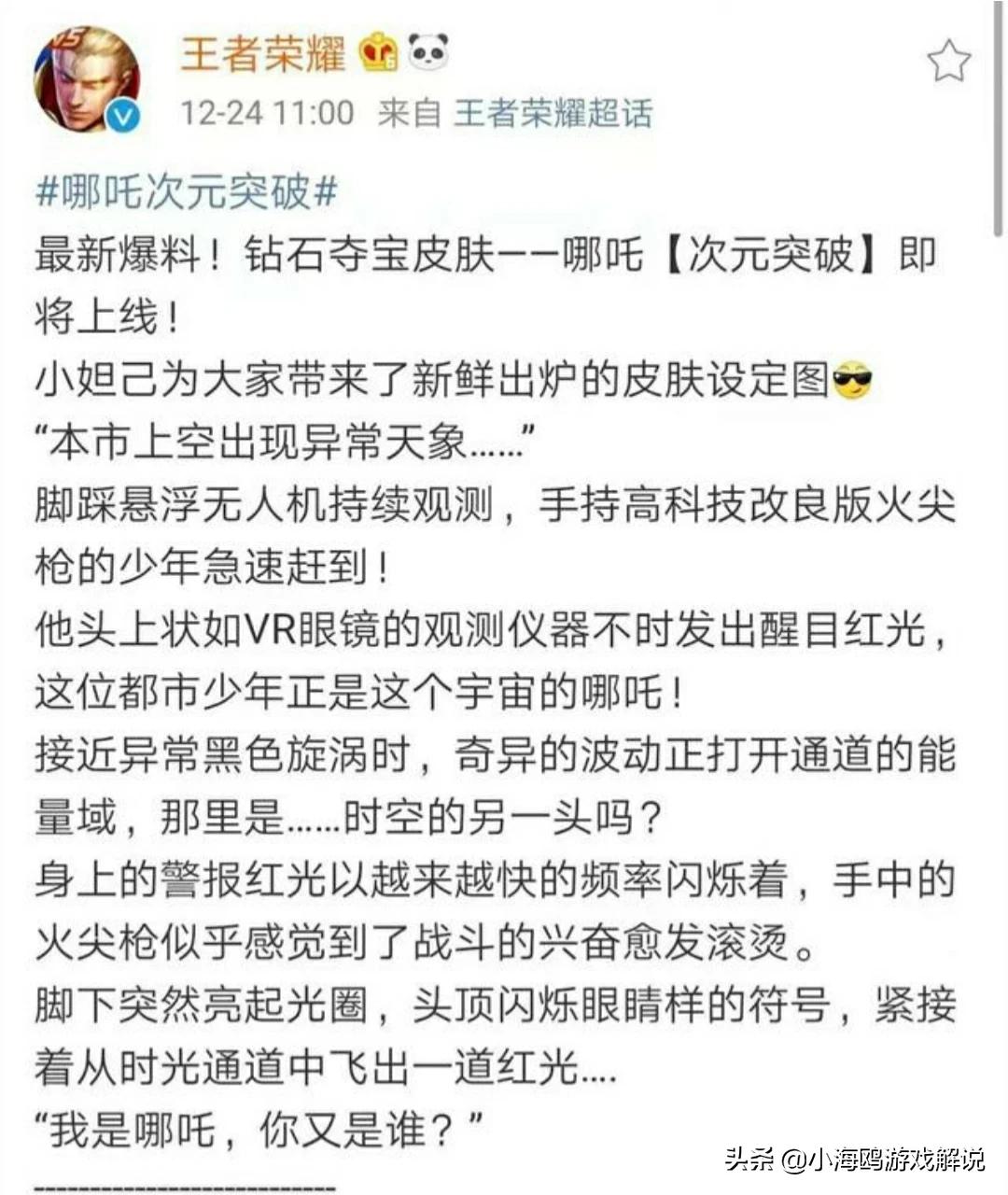 我们先来看一下官方给出来的一个消息,首先收到将会给哪吒出一款新的皮肤叫做次元突破。我们知道罗家这个英雄在王者荣耀所有英雄里面应该算得上是存在感特别低的一位,主要还是因为这个英雄的一个可玩性不高,并且他的大招需要很好的队友配合。