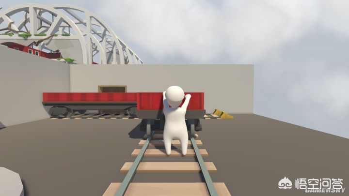 比欣赏动作喜剧更好玩的就是自己上演一场动作喜剧,也正是今天的电子游戏才赋予了我们每一个人化身为喜剧演员的能力。在《人类一败涂地》中,我们所扮演的就是这样一个浑身上下没有一丝额外材质的、胖滚滚的白色小人。他走起来仿佛一个臃肿的醉汉,仿佛随时会瘫倒在地,那一对儿面条般的手臂则是他与这个世界互动的全部工具。通过这两根面条,我们将破解一系列的环境谜题,而这个古怪的世界将协助这个古怪的小人一起,在我们一次次失败的尝试中试图将我们逗乐。