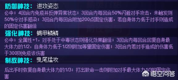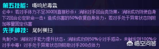 第五技能:断回合致命,伤害一半回血,对手异常再附固伤。本身125的攻没什么伤害,这个技能效果用处不大。