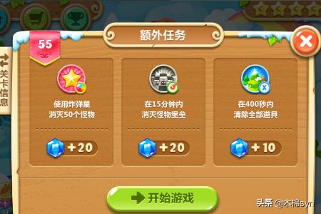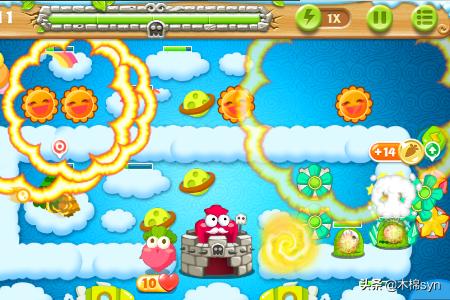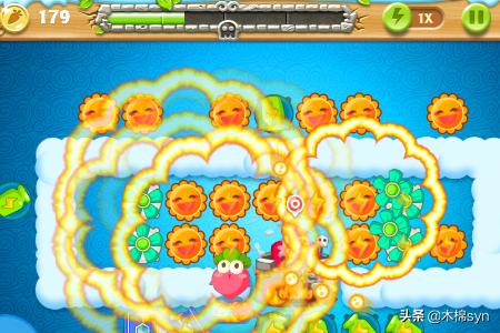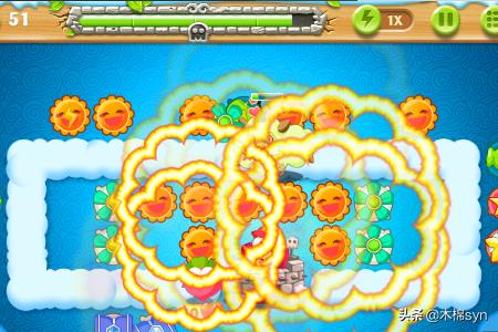 3、首先先完成炸弹星的任务,建一个炸弹星和太阳,太阳主要消除道具,当怪还没有出来的时候,攻击松树,怪出来之后,让炸弹星攻击怪,太阳消除其他道具。