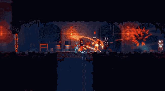 《死亡细胞》的动作手感几乎可说是横版动作游戏的极致,短刀、大剑、盾牌等武器在战斗中都能发挥出不同的效果,短刀的快速斩击,大剑将敌人拍到地板上,盾牌可以反击敌人攻击等特性给战斗带来了极强的多样性。更值得一提的武器则是致敬《恶魔城》的软鞭。玩家角色使用软鞭时能完全感受到挥鞭时从甩鞭出鞭到收鞭的节奏变化,自《恶魔城》系列逐渐淡出历史舞台后,能把这一挥鞭的妙处做到极致的游戏实在难能可贵了。