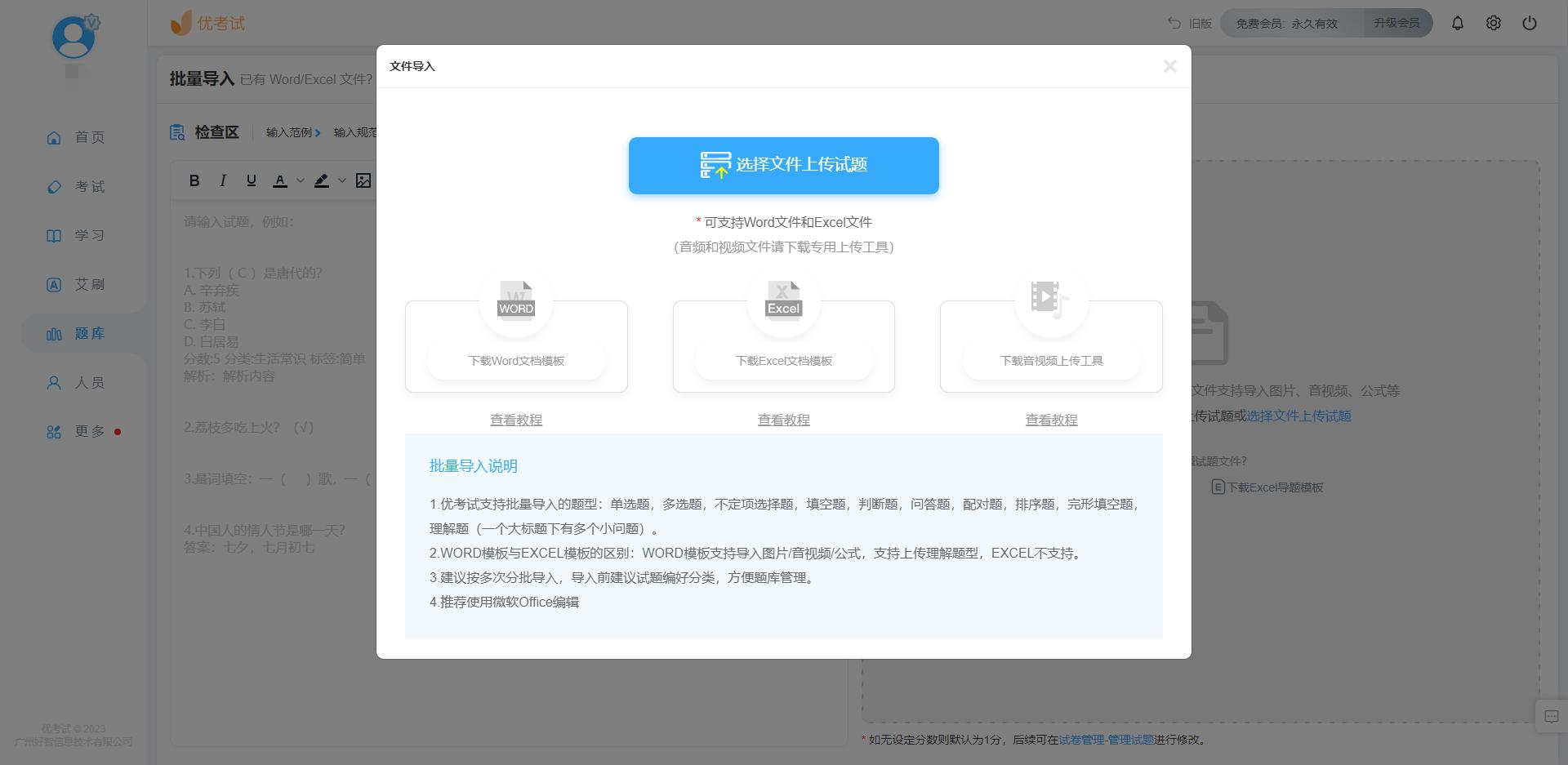 模板批量导题,支持word,excel,txt模板一键导入试题。