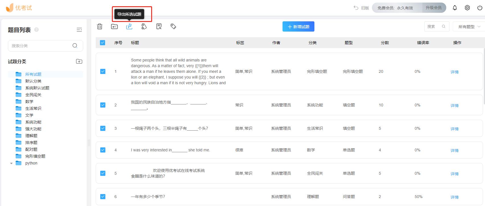 - 试题可批量导出。试题随时导出,便于纸质备份、打印等二次利用;