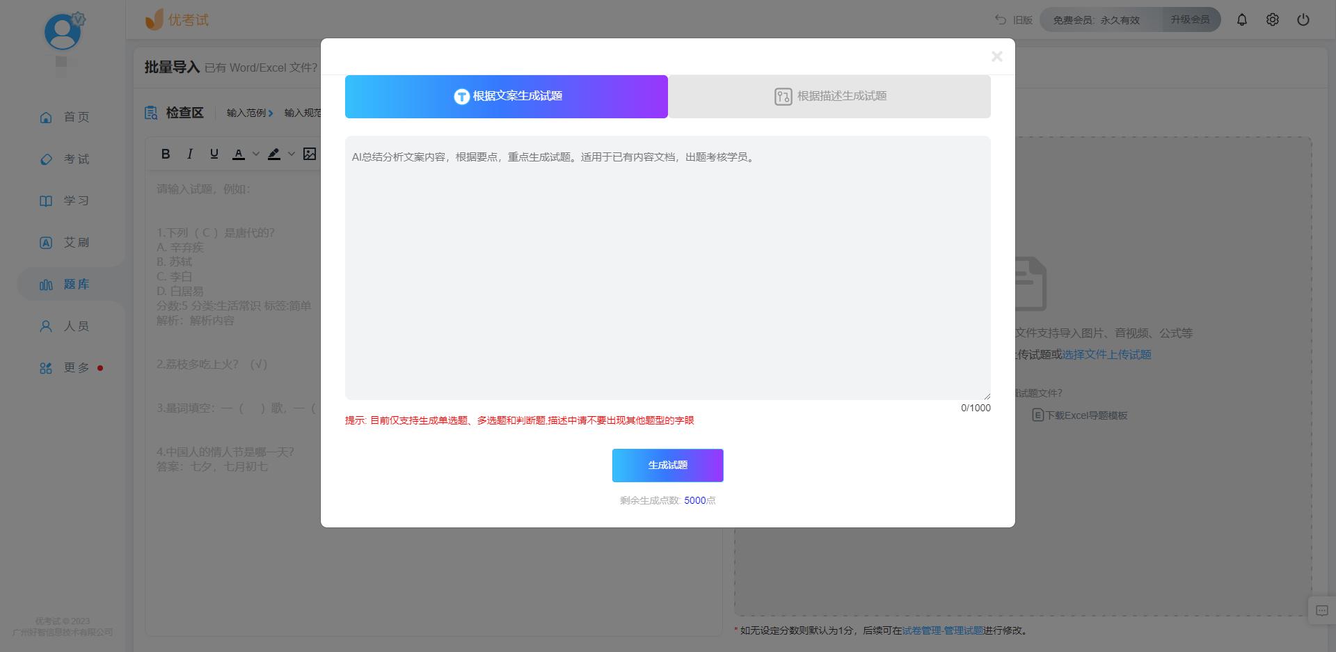 - AI生成试题。在系统中输入试题要求,人工智能立即生成试题,减轻人员出题的负担 。