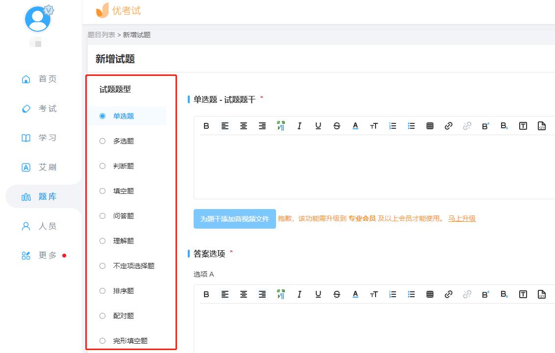 单个新增,选择试题类型,试题分类,编辑好试题内容,设置选项以及答案,分数难易程度以及试题解析点击保存即可,同时支持上传视音频。