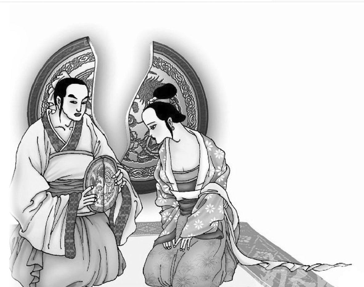 当时,陈后主昏庸,朝政腐败。徐德言敏锐的预感到,陈朝很快就会灭亡。于是把一面铜镜一分为二,自己留一半,让妻子保管另一半。约定,如遇战乱,二人被迫分离,自己一定会竭尽全力寻找妻子的下落。希望妻子在每年的正月十五,托人到集市去叫卖这半面铜镜,我找到这半面铜镜,夫妻二人就可以团聚了。