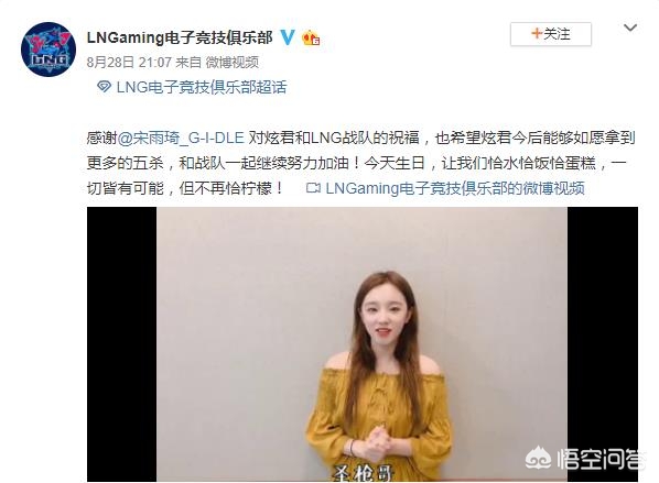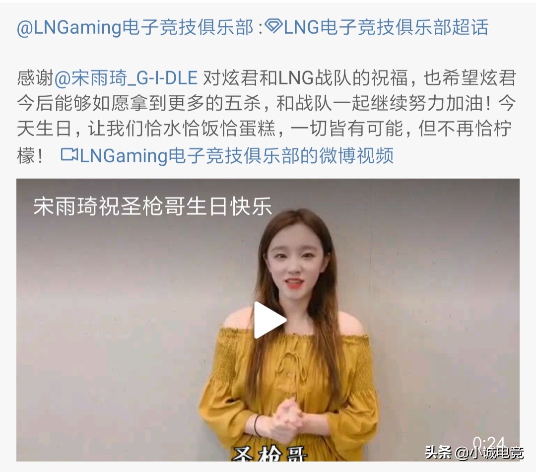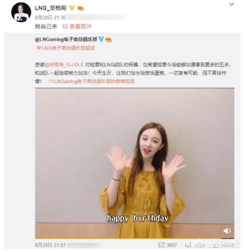原来这是圣枪哥生日惊喜之一,李宁LNG的老板李麒麟在微博表示了自己的用心,为圣枪哥联系了他喜欢的明星女团成员亲自为他录制生日祝福视频,宋雨琦_G-I-DLE在视频中为圣枪哥的生日进行祝福,表示了希望圣枪哥明年继续加油,在与RNG的比赛中的五杀很厉害,一顿夸给圣枪哥开心得不行,圣枪哥在收到生日祝福之后也是十分开心,直接将微博头像换成了宋雨琦_G-I-DLE的照片。