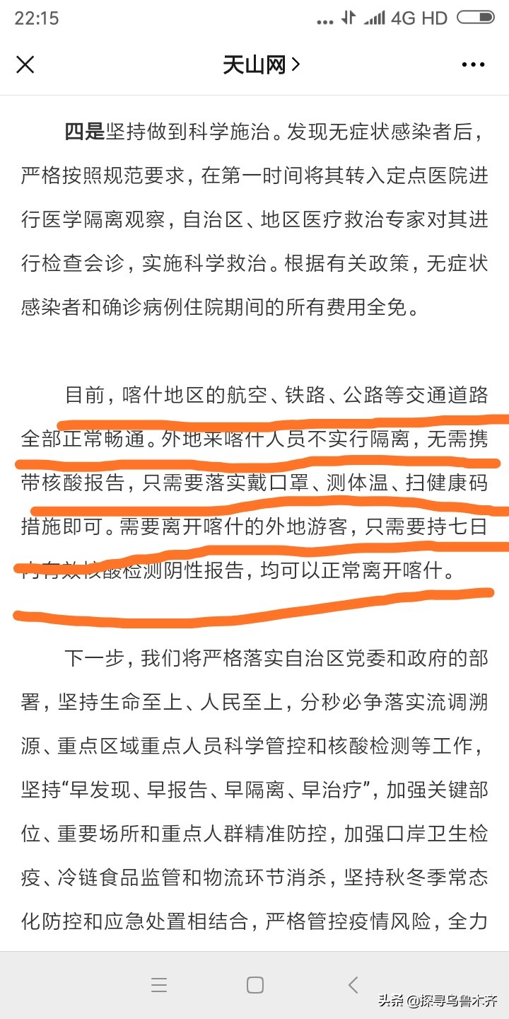 在今天下午刚刚结束的喀什疫情防控新闻发布会上,已经明确了目前喀什地区的航空、铁路、公路等交通道路全部正常畅通。外地来喀什人员不实行隔离,不需要核酸报告。需要离开喀什的外地游客,只需要持七日内有效核酸检测阴性报告。由此可见,喀什机场大量航班取消的消息不足信。