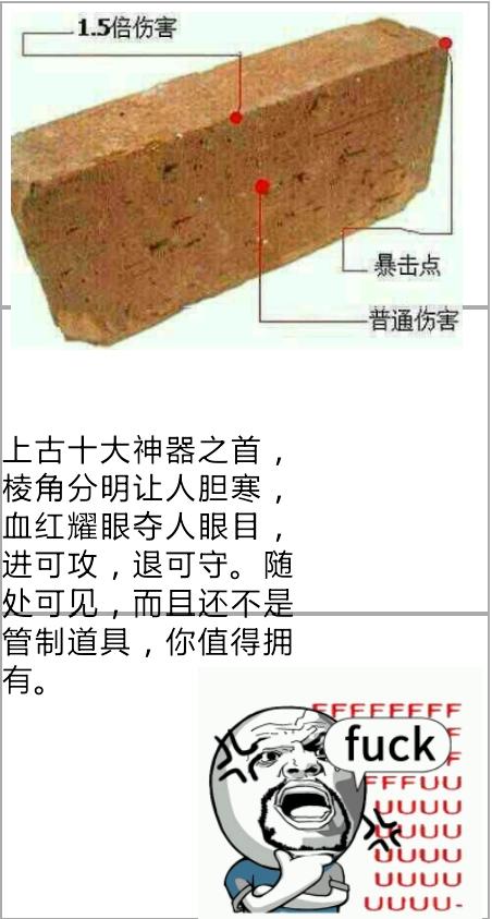 1.板砖或类似物体,胜在随处可见,伸手能得,况杀伤力巨大,建议如非深仇大恨或刻意找茬,请谨慎选择。