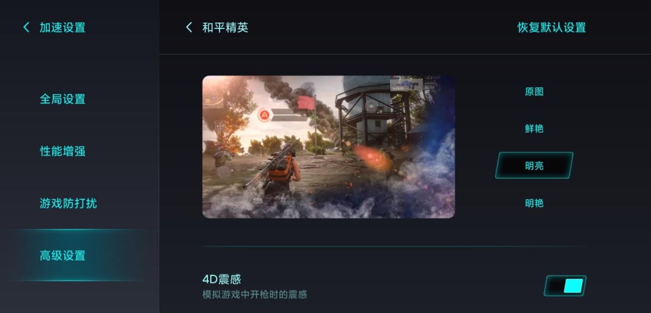 在有呢就是各内手机厂商手机上都有一个游戏加速软件,当然并没有什么用。但是里面可以调更好的画质让眼睛更舒服一点,就对比一下小编的小米手机里面有一个4d震感,这个打开,你在游戏里面开枪的话屏幕是会震动的,模仿了机械键盘的手感。
