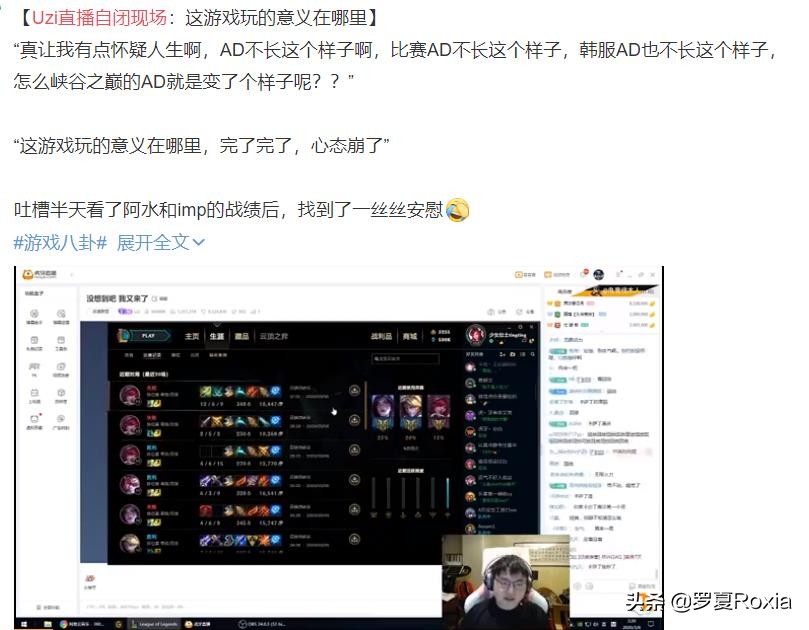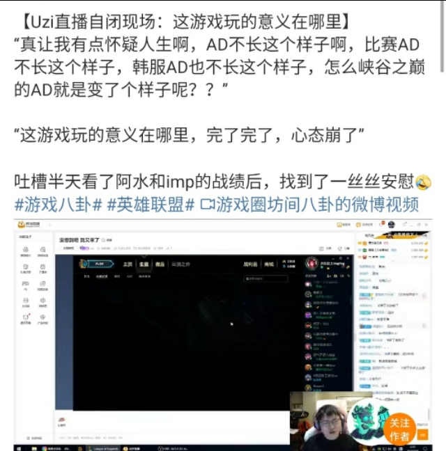 随后uzi也是在直播当中吐槽表示,看比赛当中ad不是这个样子的,韩服当中ad也不是这样的,为什么来到峡谷之巅就变样了呢?所有人都往前冲,然后也是吐槽可能是自己太菜了。