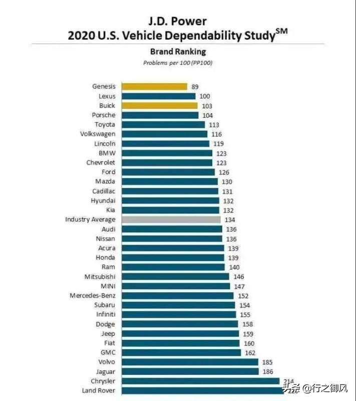 J.D.Power 2020年美国车辆可靠性研究SM(VDS)中,韩国高端品牌捷恩斯力压劳斯莱斯获得第一名,而现代、起亚、马自达的整体质量水平,均高于市场平均水平。