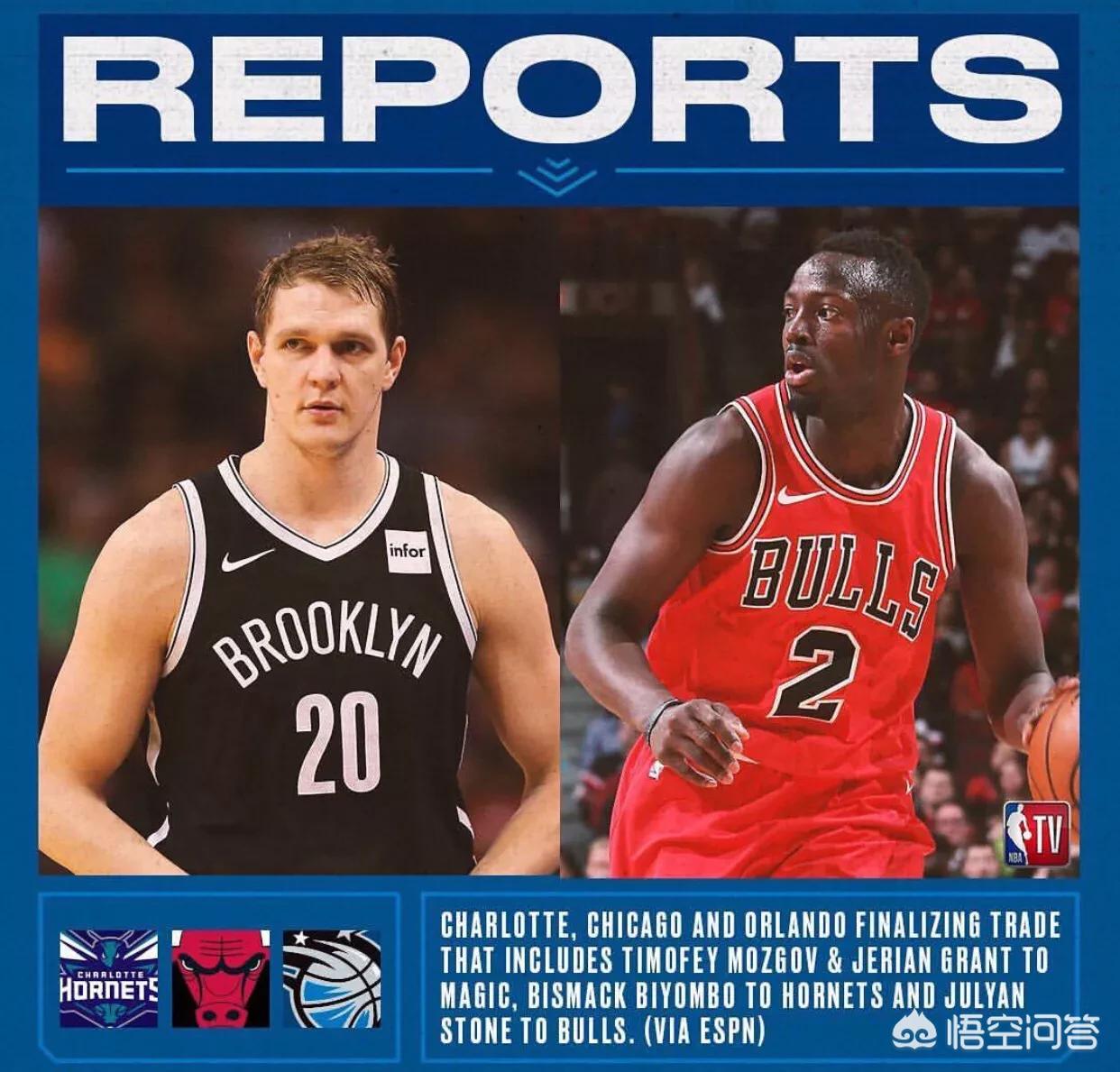 根据ESPN报道,黄蜂魔术公牛完成了三方交易。交易具体细节是黄蜂队把莫兹戈夫送到魔术队获得比永博,把后卫斯通送至公牛队,公牛队把格兰特送到魔术队。