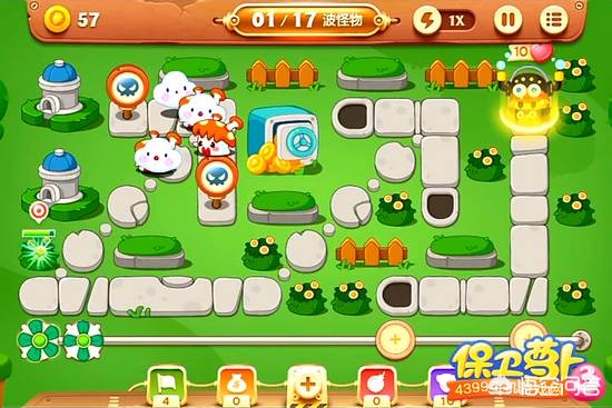 4、最终布局如下图所示,主要还是以风扇为主,配合冰冻星的减速。注意金币一多要及时增加炮塔,不要拖。