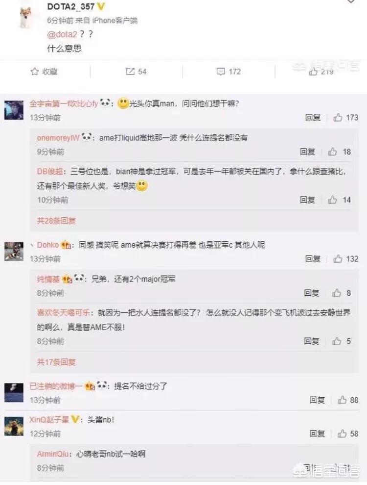 支持Ame的:就想说那些喷ame的,ame水人高地一打四团灭对手忘记了?决赛那一波,我只想说,有资格在救世主和罪人之间徘徊的,一定是最强之人。我挺ame。希望他能够继续加油,下一次能够拯救世界完成救赎。千万不要就此沉沦。和lgd一起最终登顶ti。加油!用zhou神的一句话,我要把你们欠我的冠军,一个个都拿回来!