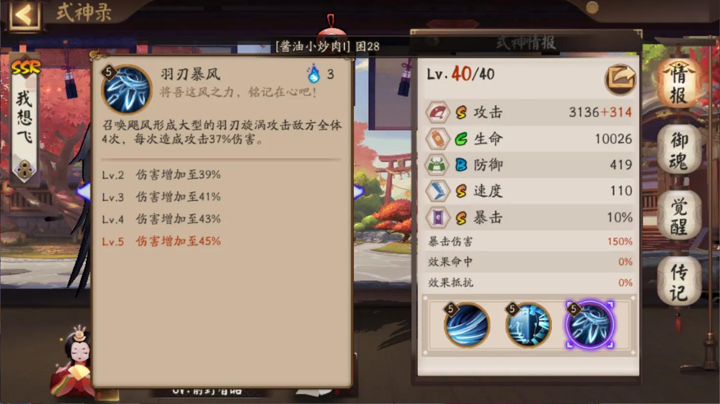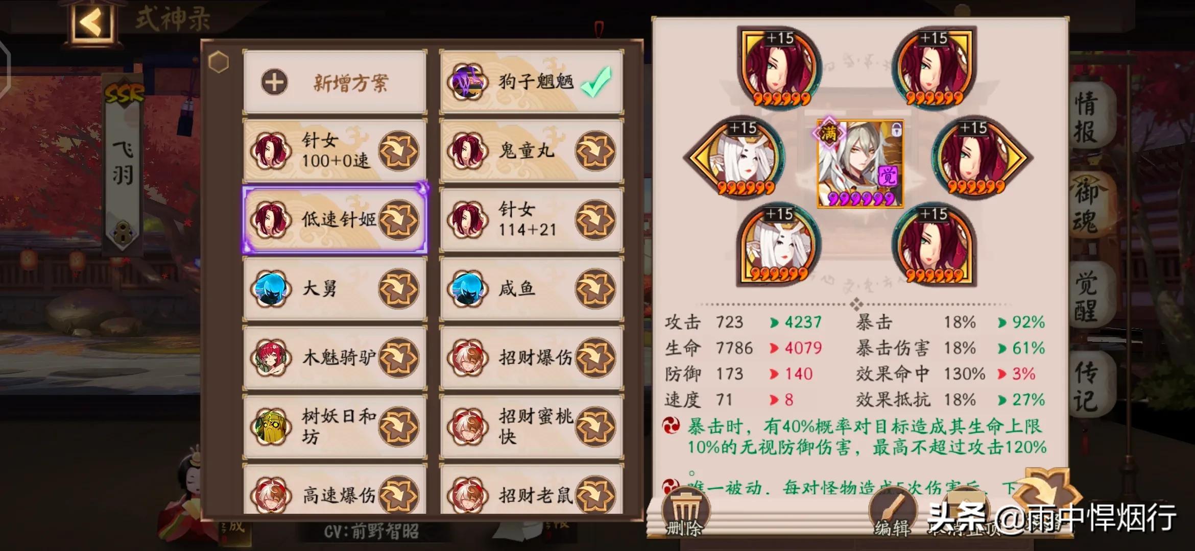 SSR里最屌的四段伤害AOE式神,被动免控一次,输出叠满BUFF能提升80%伤害。就业场景很多,御魂搭配攻攻爆针女歌姬,一定要满暴击,因为针女要暴击才触发,没有爆伤套的话就攻攻暴反堆爆伤,平时的小活动、歌姬逢魔、超鬼王都行,有狗粮的话养两只,不亏,突破有时候看阵容也能打,地藏小白是他克星,因为是四段伤害AOE,斗技的话可以试试速命生魅妖/雪幽魂/魍魉,很香!
