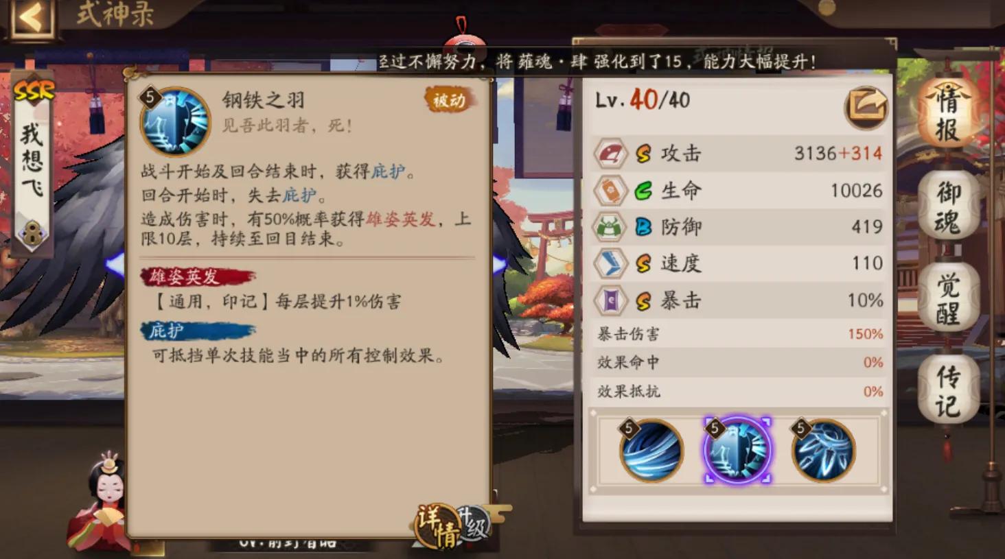 被动技能钢铁之羽,也是在近期得到了加强,增加效果:每层印记提升1%伤害,满级之后上限达到80层,这个加强就很猛了,在后期直接提升80%的输出,实测在超鬼王清小怪过程中,其伤害在后期有了质的飞跃,对喜欢狗子的玩家来讲是个很不错的福利!庇护也是狗子一个很重要的被动,可抵挡单次攻击所有控制效果,实测可以抵挡大岳丸的放逐这种强控,