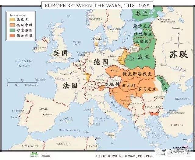 一、奥匈帝国在一战后被分裂后,欧洲开始碎片化,真正的大国只有德法苏联三国(参看下图)。
