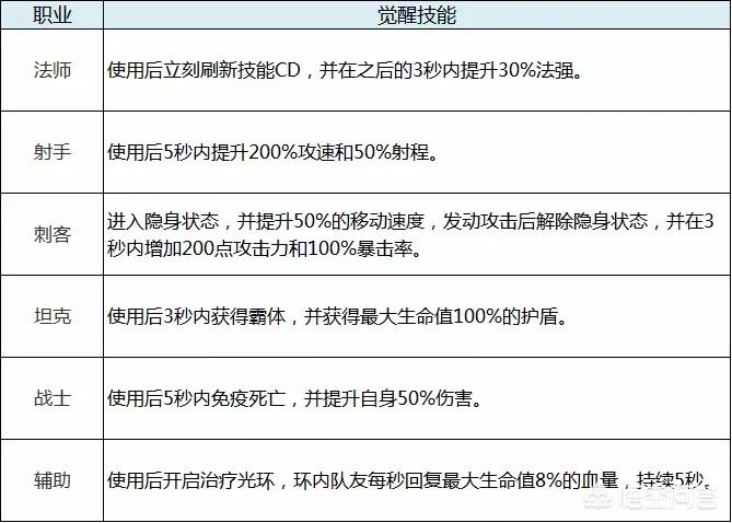 同时为了平衡不同英雄在前后期的差别。增加了六个技能。法师的是:使用后即可刷新所有技能CD并在3秒内提升30%的法强;射手的是:使用后5秒内提成200%的攻速和50%的射程;刺客的是:进入隐身状态,并提升50%的移动速度,发动攻击后,解除隐身状态,并在3秒内增加200点攻击力和100%的暴击率;坦克的是:使用后3秒内获得坝体,并获得最大生命值百分之百的护盾;战士的是:使用后5秒内免疫死亡,并提升自身50%的伤害;辅助的是:使用后开启治疗光环,圈内队友恢复最大,生命值8%的血量持续5秒。