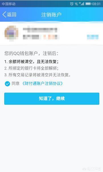 4.将QQ账号资金全部提现,并点击“知道了,继续”注销。